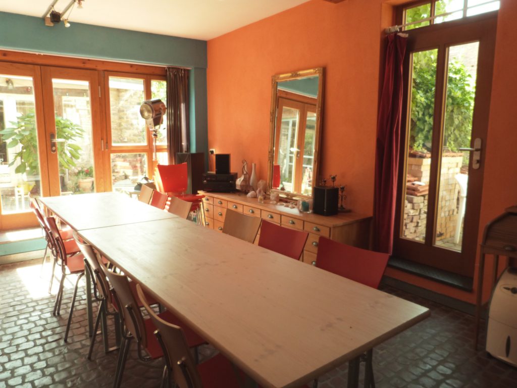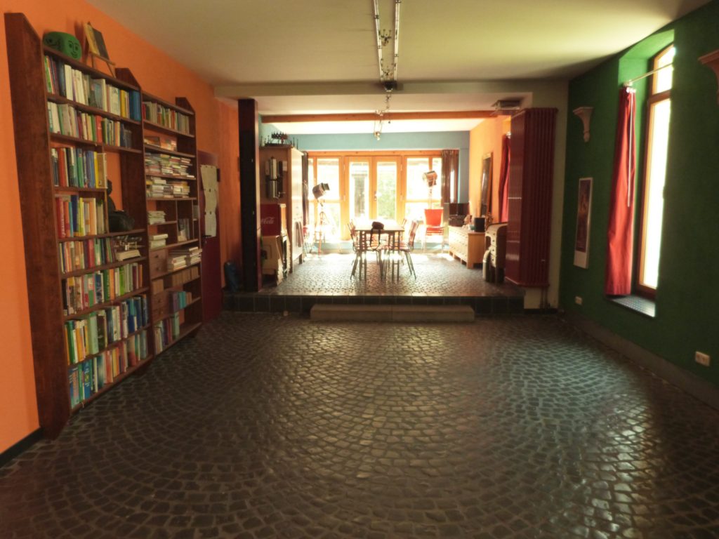 Tische, Stühle, Hocker und eine kleine Küche in einem Küchenschrank sind vorhanden ….